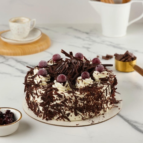 Vanilla and chocolate cake sponge soaked with raspberry juice, layered with vanilla, chocolate, and banana cream, filled with cherries and almonds.